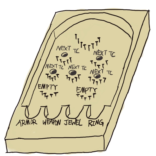 Every time a player kills a monster, a marble is given as an attempt: if it reaches the bottom, one of the possible base types is selected; but if it falls into a hole before reaching the bottom? Another pinball machine starts then, this time slightly easier to reach the bottom, but also with slightly less powerful rewards. This selection chain keeps going, until the marble finally reaches one of the rewards.